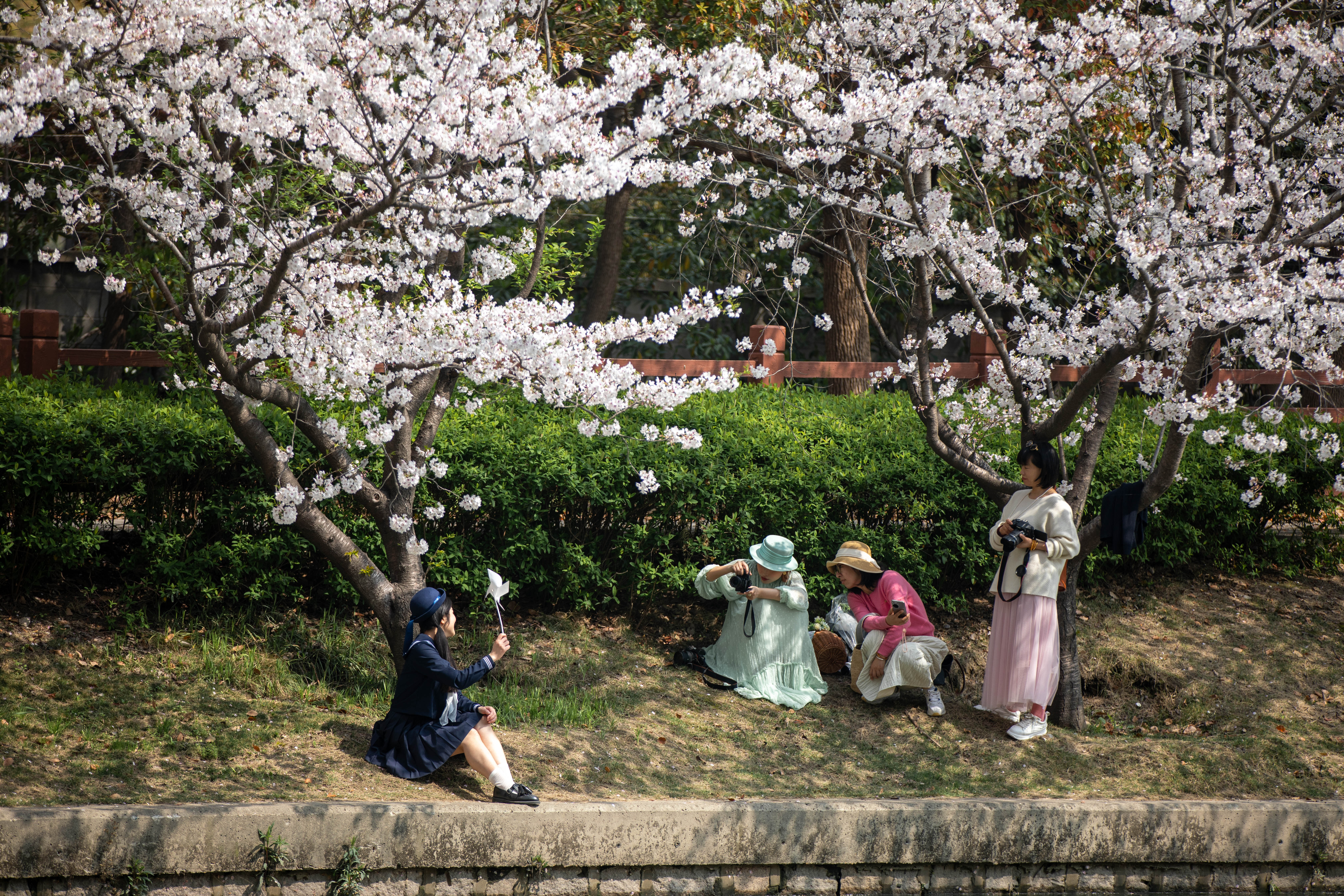 In the Xinzhuang Plum Garden, the hydrangeas are in full boom. The branches are covered in clusters of snow-white blossoms that start out green like matcha and become snow-white as they bloom, creating a dreamlike, ethereal scene.