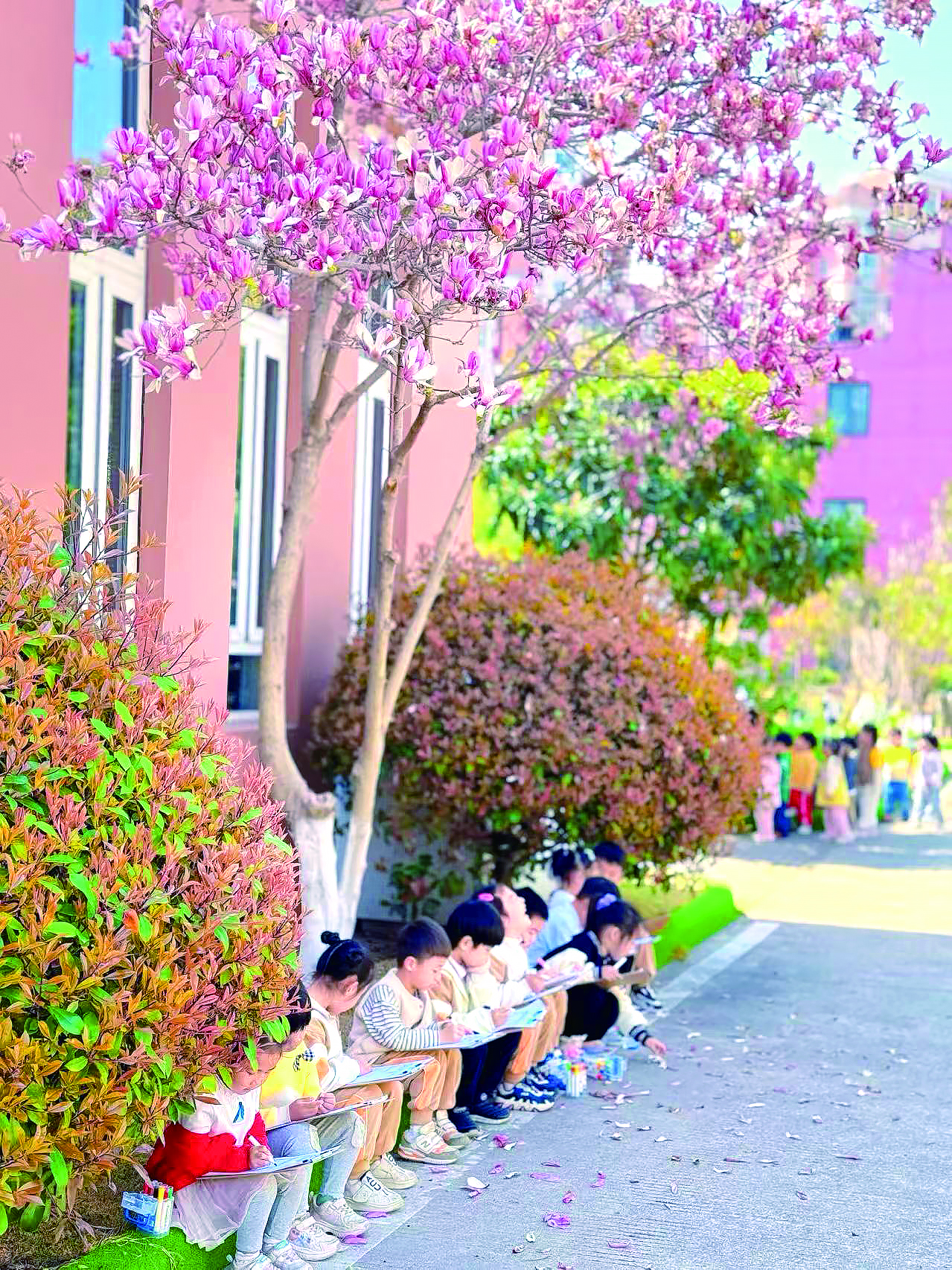 As the semester begins, schools look springlike. The magnolias in front of the school are quietly blooming, the willow branches by the playground are sprouting new green leaves, and the garden forsythias are gold.