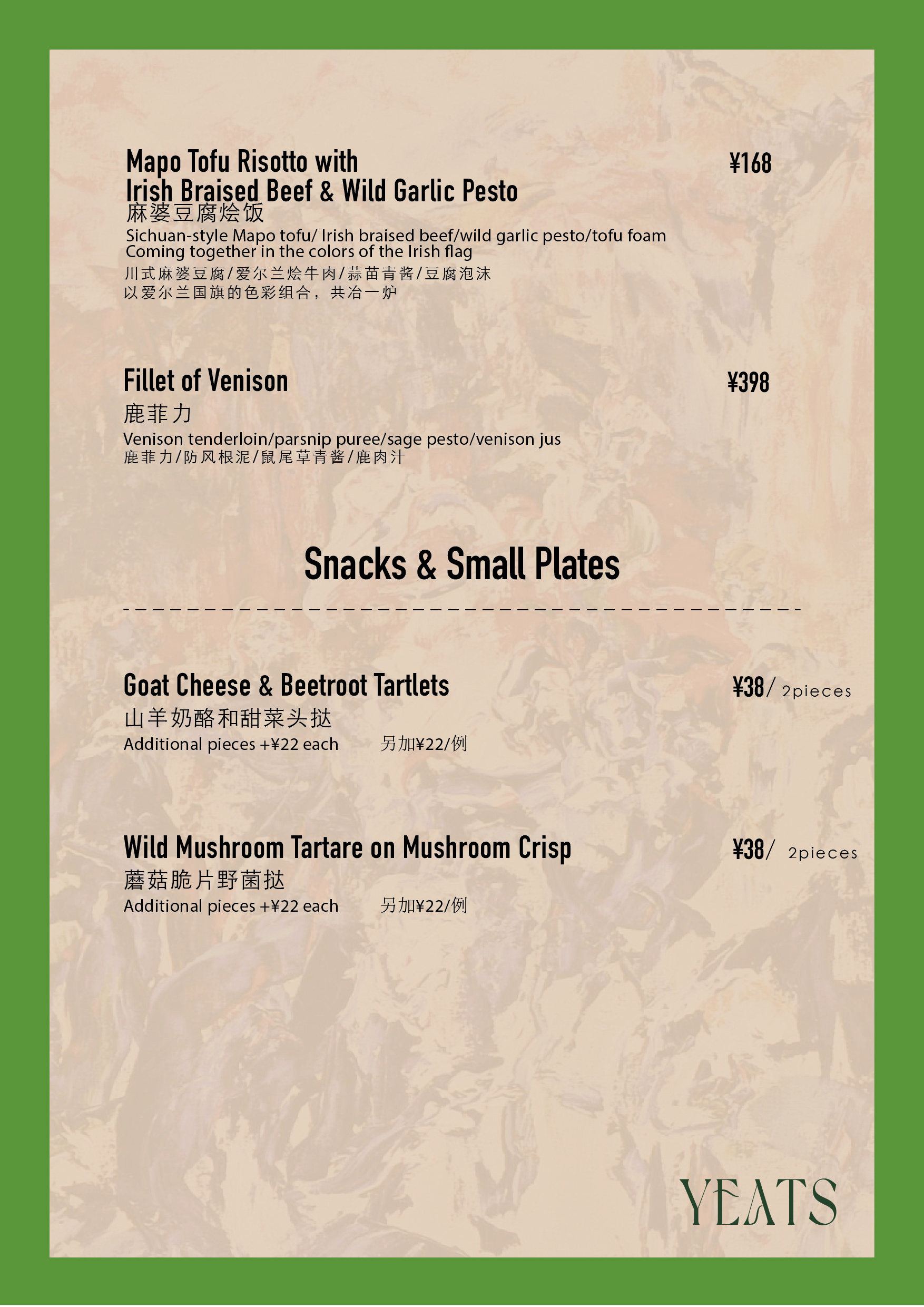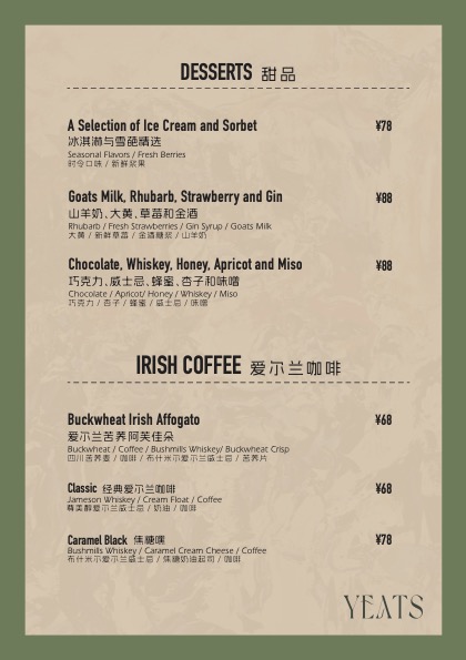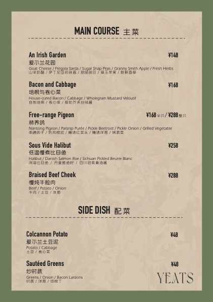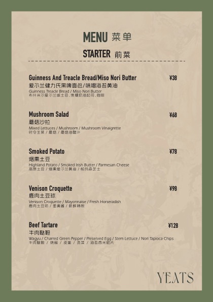 That Guinness and treacle bread goes for 38 yuan. The venison croquettes will set you back 98 yuan. Mains range from 148 to 288 yuan. Sides like colcannon are 48. Sweets like the strawberries and rhubarb are 78 to 88. Here's the full menu of their soft opening, with a few new dishes they've added since our visit: