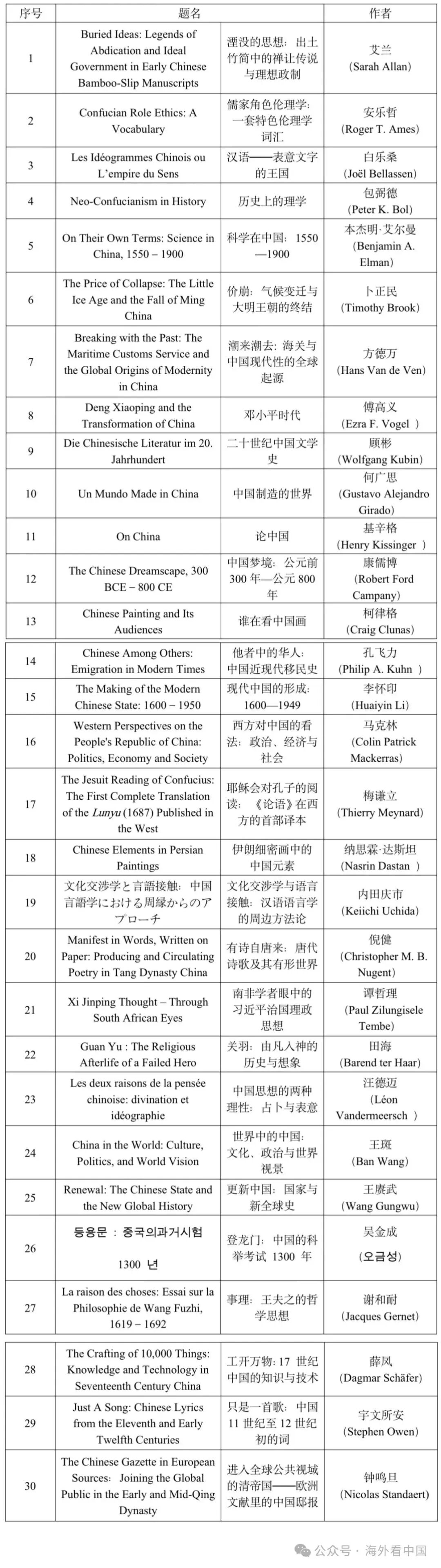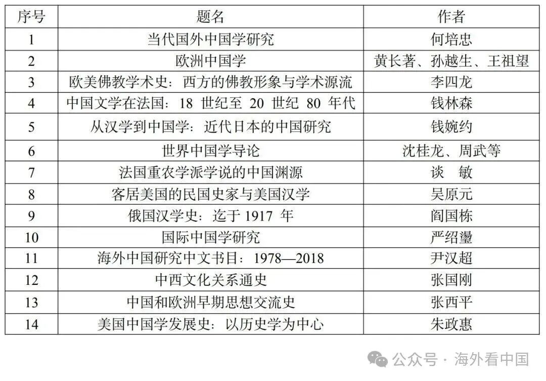 The list covers 54 major works published between 2005 and 2024, including 30 by senior international scholars, 10 by young overseas researchers, and 14 by Chinese scholars working on World China Studies.