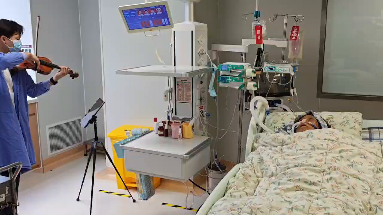 Tang Xing plays for a mother in the ICU at Dongguan Hospital of Traditional Chinese Medicine.