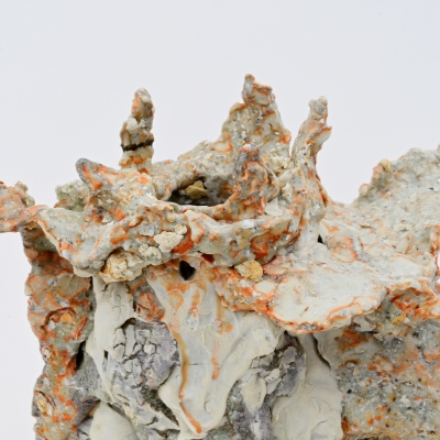 Combined with unique raw materials such as feldspars, whole rocks, metal or glass powders, his glaze forms are buried in various strata of sand or kaolin (unrefined porcelain clay) to preserve their structure in the firing stage.