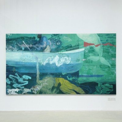 Approaching the work, viewers are drawn into an immersive, slightly lowered perspective, as though floating on or beneath the water’s surface. A sinking figure, possibly a crew member, drifts below, while another clutches a small, precious creature onboard, refusing to let go.