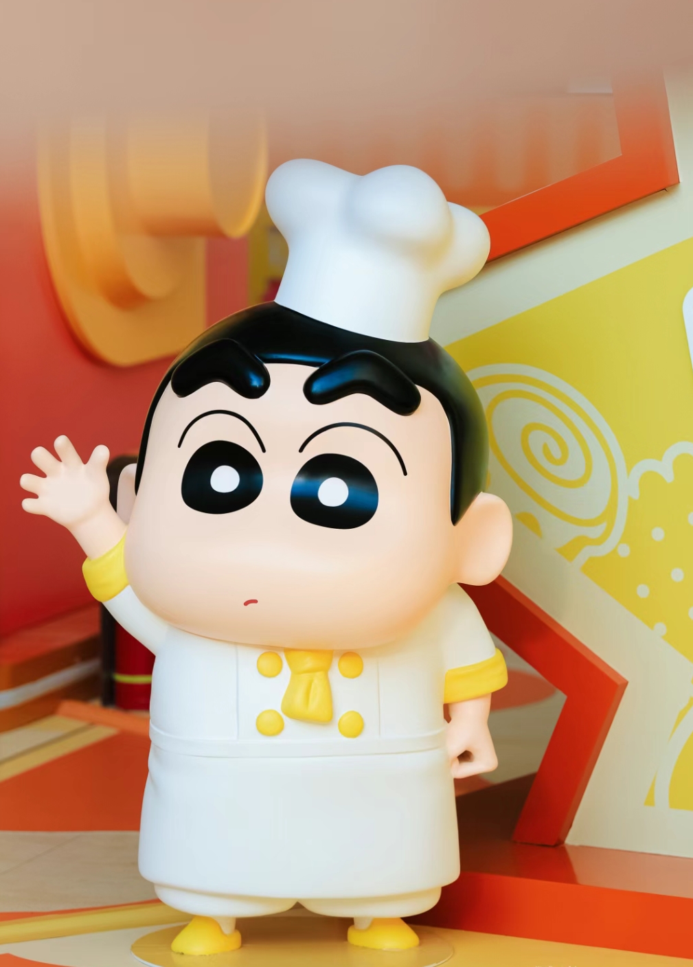 Shiro, Shin-chan's dog, wearing a chef's hat, is dutifully squatting, waiting for Shin-chan, while Peko and Poko also don baker's uniforms to welcome visitors.