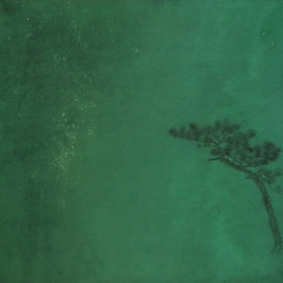 Classical Chinese ink and green painting of minimalist landscapes on exhibit