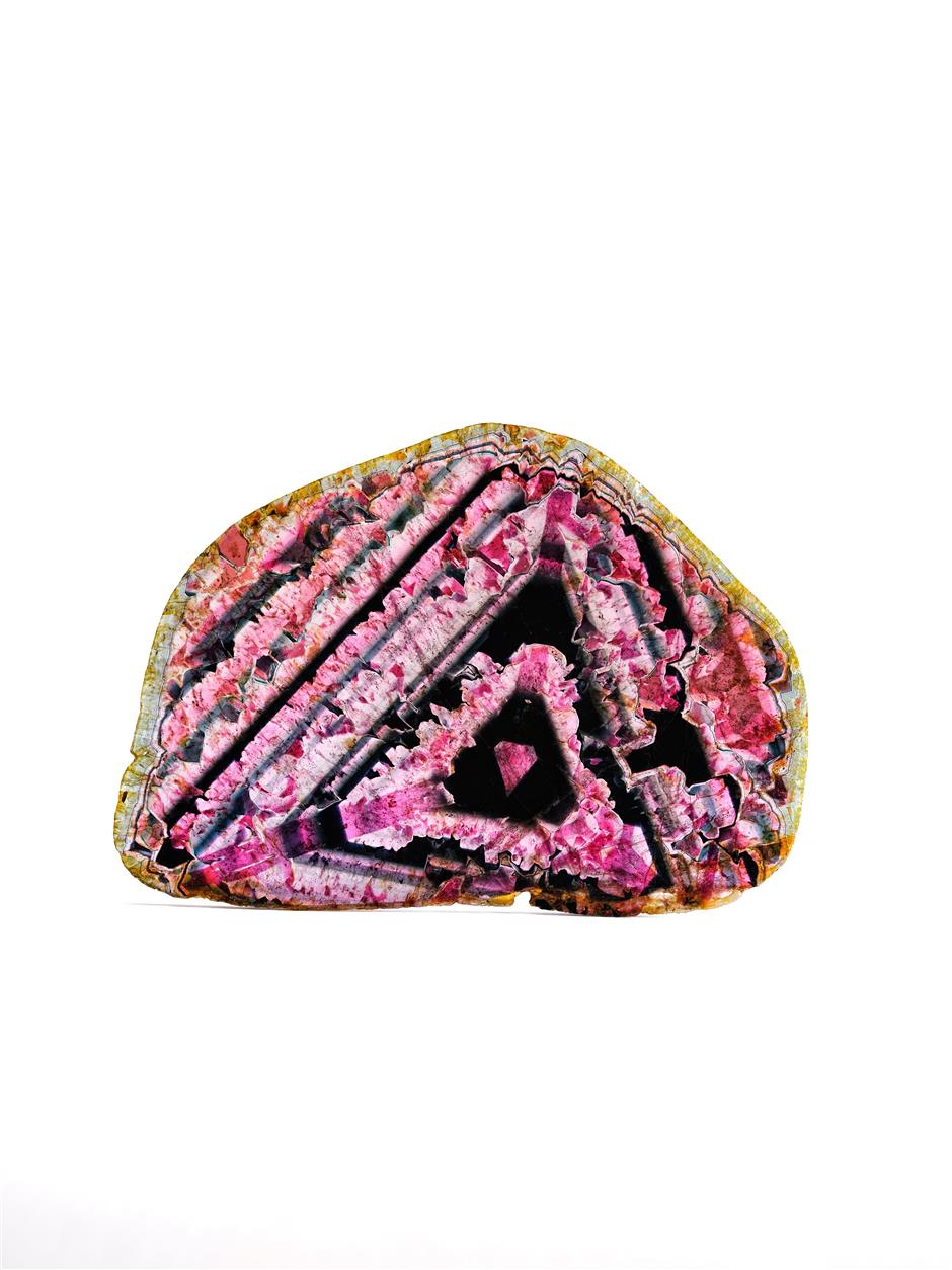 It begins with minerals in their raw state, dismantling the assumption that dramatic geometries must be man-made. A highlight here is a fluor-liddicoatite tourmaline from Madagascar, whose polished cross-section reveals concentric bands of color arranged with near-mathematical precision. The effect resembles a deliberately composed graphic pattern, yet it is the outcome of atomic repetition rather than human intent.