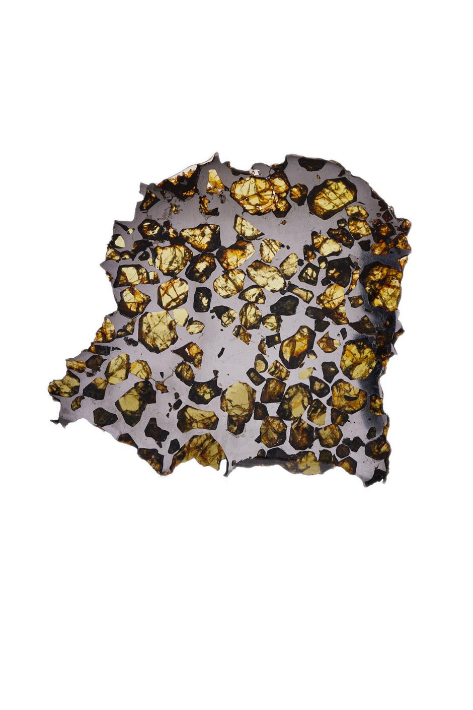 The Space section introduces minerals not formed on this planet. The focal point is the Esquel pallasite meteorite, discovered in Argentina, its iron-nickel matrix embedded with translucent olivine crystals. Suspended between scientific specimen and sculptural object, it reframes mineralogy as a cosmic discipline, offering insight into the early formation of the solar system.