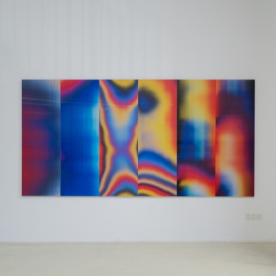 At the center of the exhibition is French artist Pascal Dombis, whose three-panel lenticular work pulses with shifting bands of blue, yellow, red, and violet. Created through algorithmic programming, his work explores the chaotic beauty of repetition and digital interference. From afar, the piece evokes the movement of heat or sound; up close, it becomes a kaleidoscope of pixelated tension – always in flux, never fixed.