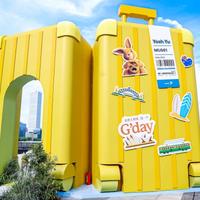 The pop-up unfolds across three themed zones celebrating Australia's natural beauty and easy-going lifestyle. At its entrance, a giant suitcase installation sets the tone for the journey, greeting guests with a warm Australian welcome.