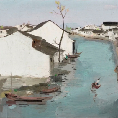 Created in 1955, this painting represents Zao's transition from flat linear symbols to a more three-dimensional spatial depth. Zao signed the Chinese title "小桥流水" on the back of the painting.