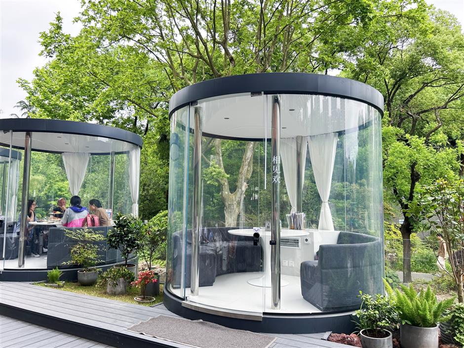 Outside, the cylindrical glass rooms are ultra Instagrammable – but they're not cheap. Booking one requires a minimum spend of 388 yuan and a reservation at least 2-3 days in advance. Upstairs is Monet Evo Park Restaurant (莫奈湖畔餐厅), a stylish spot for Western cuisine and afternoon tea.